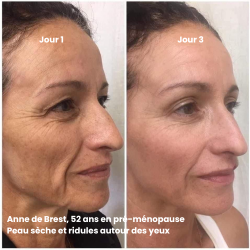 Dès la 1ʳᵉ semaine, cou plus ferme et rides du sourire moins marquées. Effet rajeunissant.